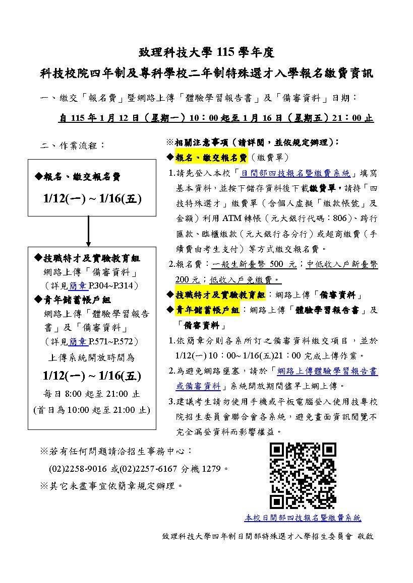 【四技特殊選才】本校115學年度四技特殊選才入學報名繳費資訊