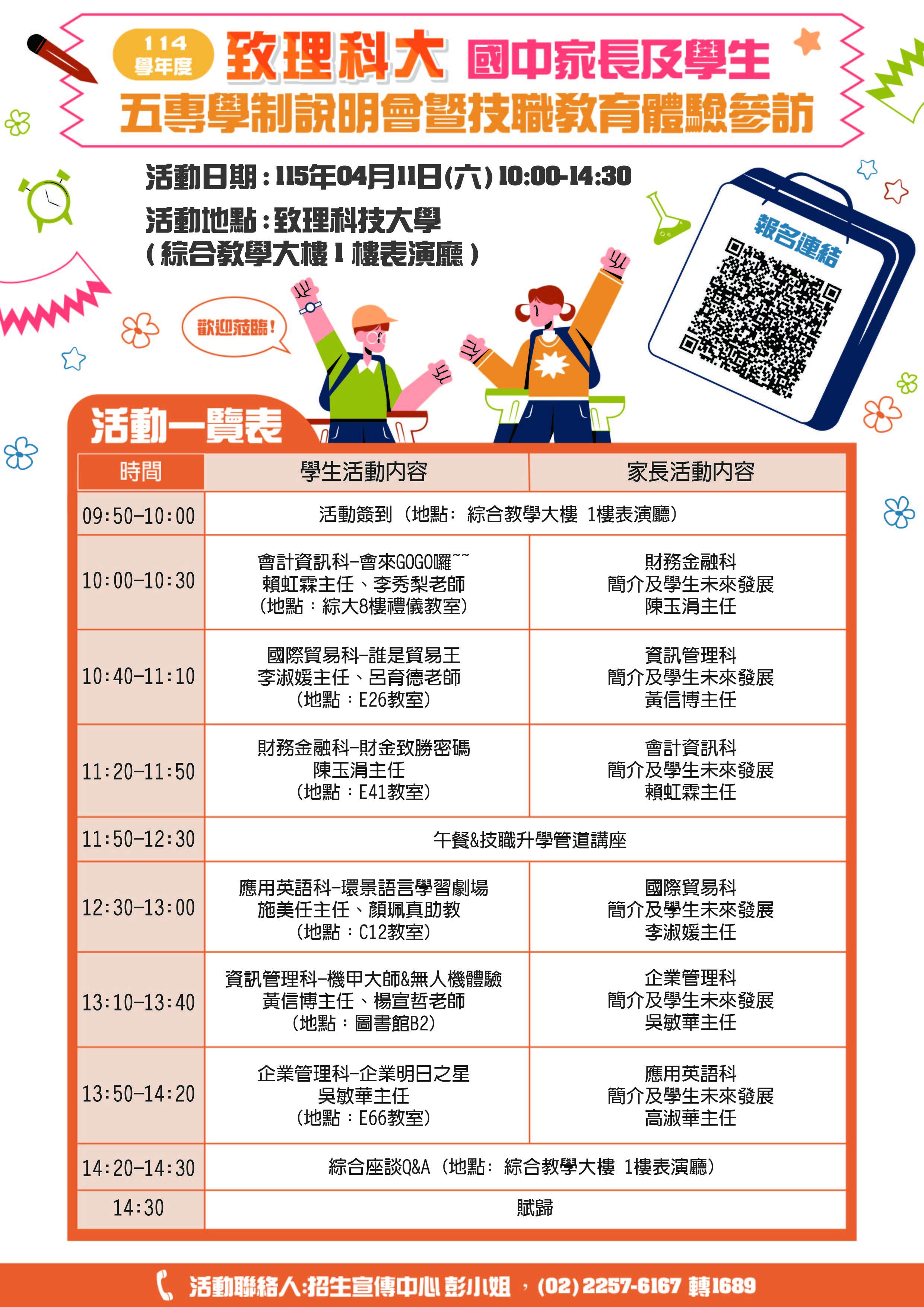 聯絡窗口:致理科技大學 招生宣傳中心 彭小姐(02)2257-6167 #1689