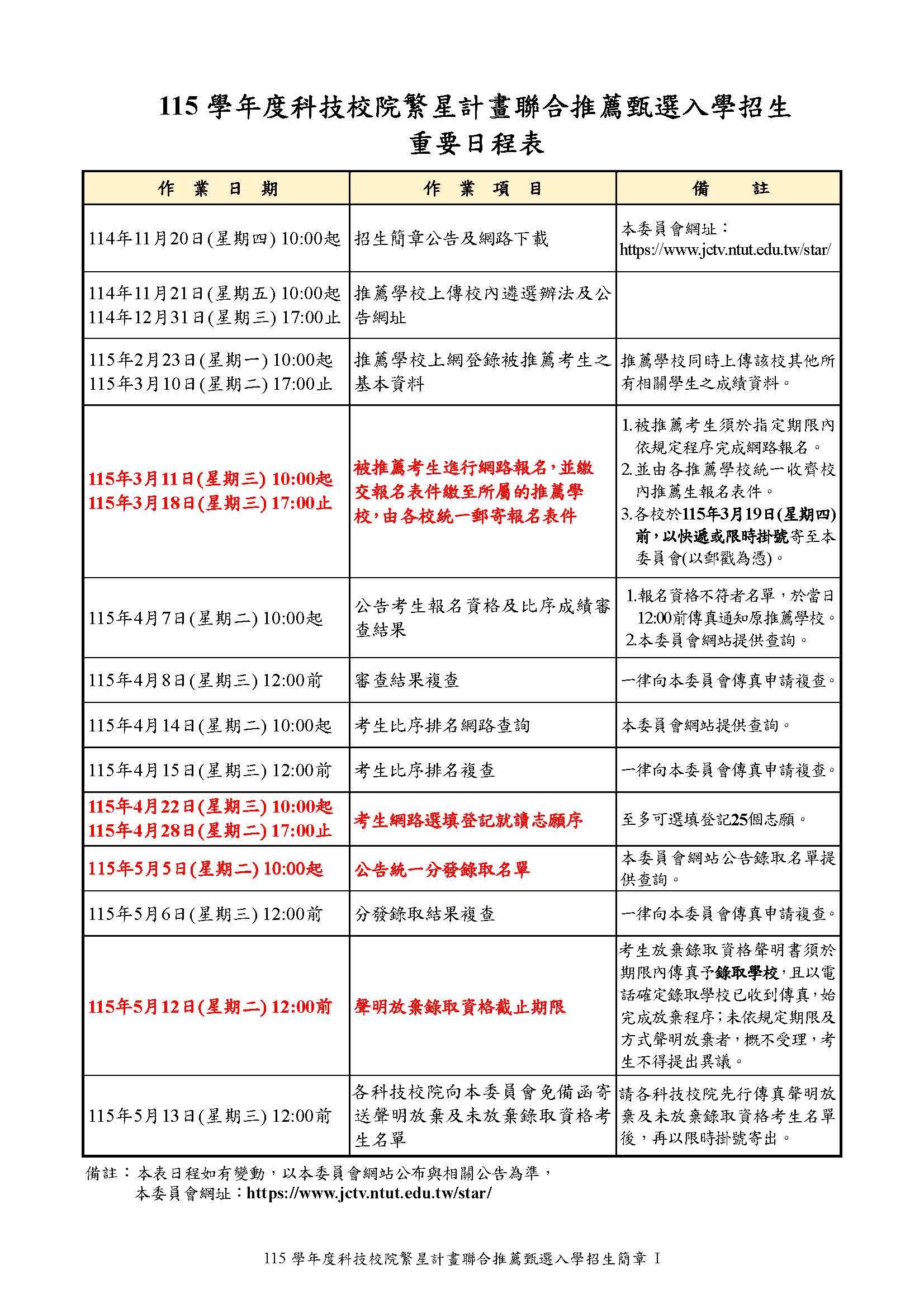 ◆ 115學年度科技校院繁星計畫聯合推薦甄選入學招生 重要日程表