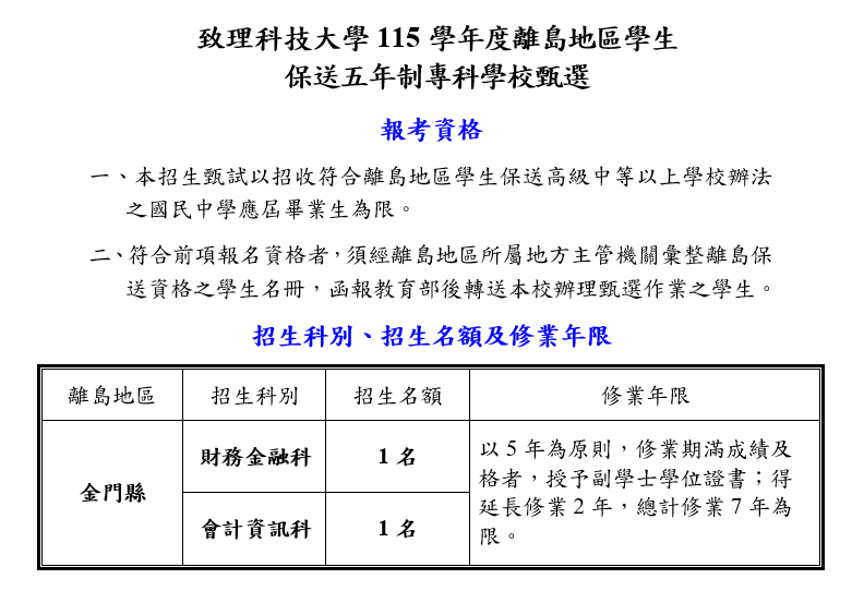 離島地區學生保送五專甄選招生